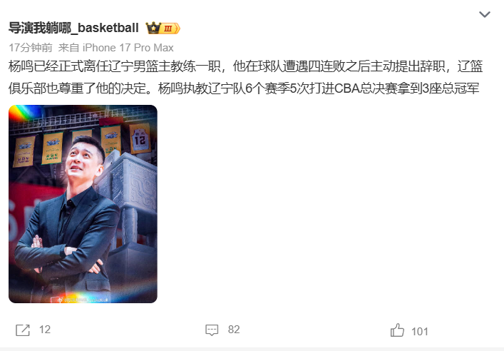 “知名”辽篮媒体人导演赛后直接确认了杨鸣下课的消息:杨鸣已经正式离任辽宁男篮主教练一职,他在球队遭遇四连败之后主动提出辞职,辽篮俱乐部也尊重了他的决定。